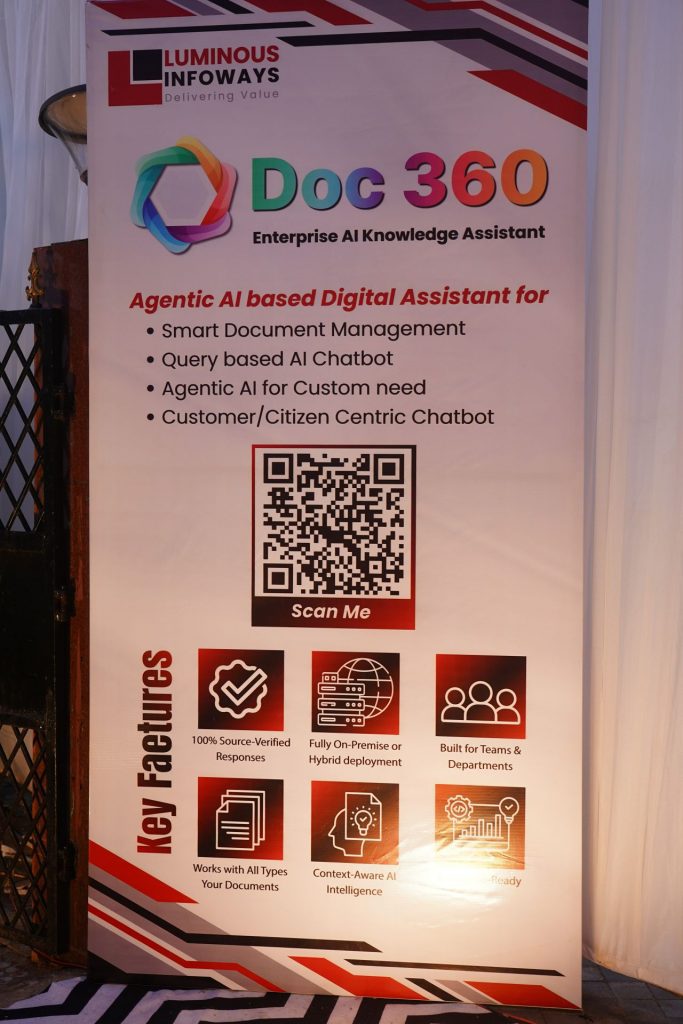 One of the key highlights of the evening was the launch of Doc 360 – Enterprise Knowledge Assistant, an AI-based platform designed to make document management and knowledge sharing easier for organisations. Built as an Agentic AI platform, it is a self-learning system with an advanced DMS (Document Management System) inbuilt. It can understand information, respond to queries, and help teams work more efficiently. It can also be integrated with existing systems and customised as per organisational needs.